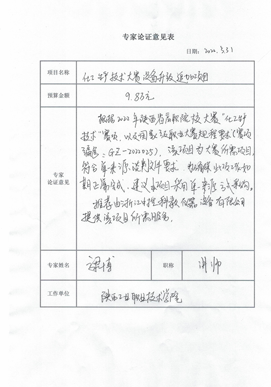 根据2022年全国职业院校技能大赛化工生产技术赛项规程(赛项编号:GZ-2022025)要求及相关专家论证意见,陕西工业职业技术学院化工生产技术大赛设备升级追加项目拟采用单一来源采购方式,该项目拟由浙江中控科教仪器设备有限公司承担。现将有关情况向潜在的供应商广泛征求意见。征求意见期限从2022年3月31日起至2022年4月8日止。